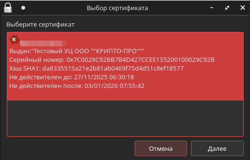 Также не забудьте проверить, что для выбранного сертификата у вас установлены все необходимые корневые и отозванные сертификаты. Пример необходимых сертификатов можно проверить командой: