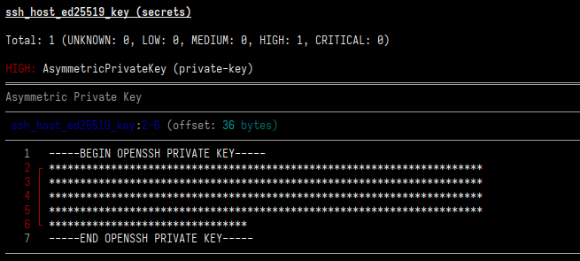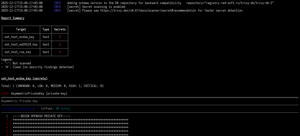 trivy fs --db-repository registry.red-soft.ru/trivy-db/trivy-db --scanners secret --report summary /etc/ssh/