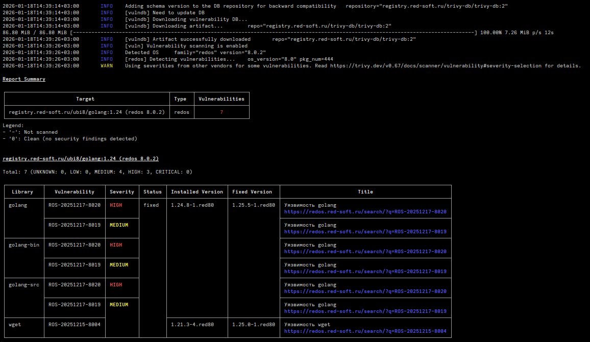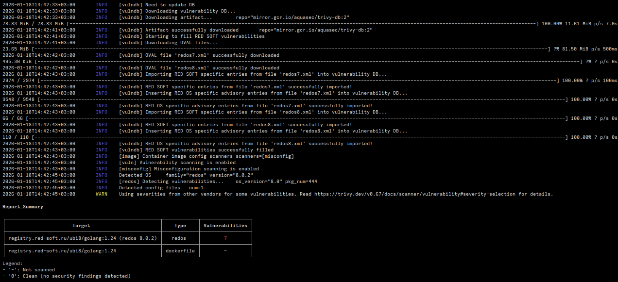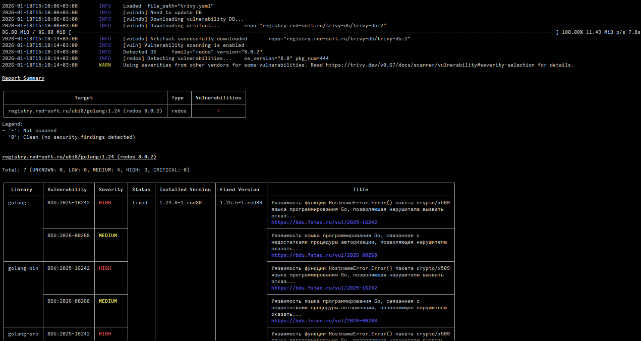 Для удобства администраторов подготовлен и выгружен в публичный реестр специализированный образ registry.red-soft.ru/trivy-db/trivy-db, включающий в себя данные всех баз уязвимостей – собственной базы уязвимостей trivy, базы уязвимостей РЕД ОС и базы уязвимостей БДУ ФСТЭК России. Использование специального образа при сканировании компонентов ОС доступно с помощью опции --db-repository в командах сканирования. Обновление и выгрузка образа в реестр происходит автоматически 2 раза в день.