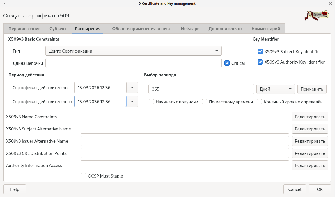 13. Определите срок действия сертификата (10 лет).