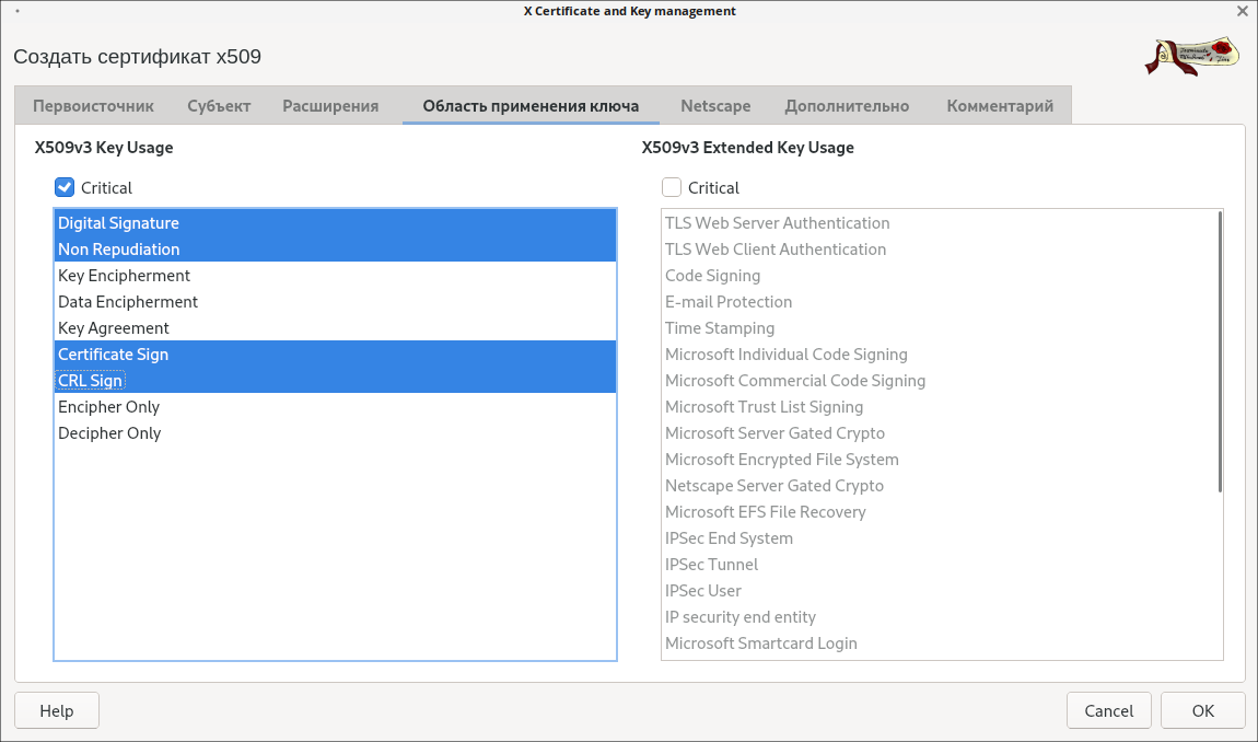 15. Отметьте пункт Critical, выберите функции Digital Signature, Non repudation, Certificate Sign, CRL Sign.