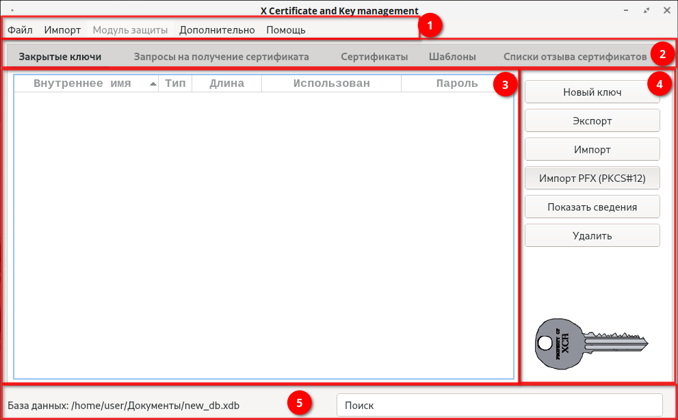 После установки запуск программы доступен через «Главное меню» — «Стандартные» — «XCA» или через терминал командой: