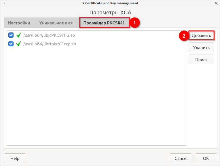 3. Нажмите «Добавить» и найдите файлы «libjcPKCS11-2.so» (для JaCarta) и «librtpkcs11ecp.so» (для Рутокен). Они могут находиться в директории /usr/lib или /usr/lib64. Также можно выполнить поиск с помощью команды: