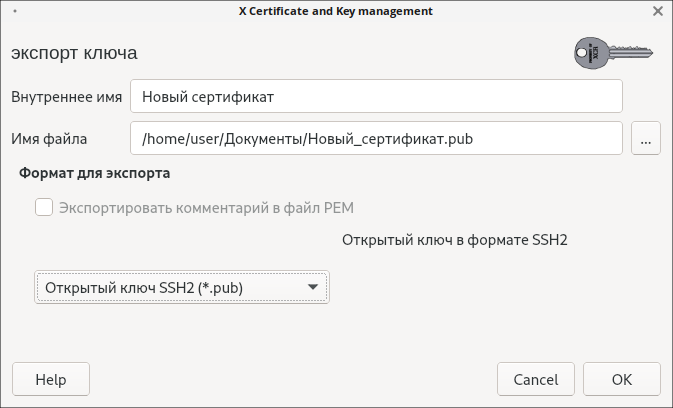 4. В появившемся окне в поле «Формат сертификата» выберите Открытый ключ SSH2 (*.pub) и укажите путь к файлу, затем нажмите «ОК»: