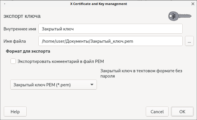 4. В появившемся окне в поле Формат для экспорта выберите Закрытый ключ PEM (*.pem), укажите путь к файлу, затем нажмите «ОК»: