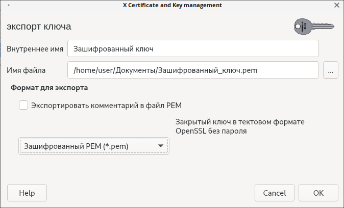 4. В появившемся окне в поле Формат для экспорта выберите Зашифрованный ключ PEM (*.pem), укажите путь к файлу, затем нажмите «ОК»: