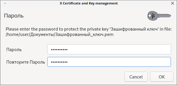 5. В появившемся окне Х Certificate and Key management нужно ввести пароль для доступа к этому ключу: