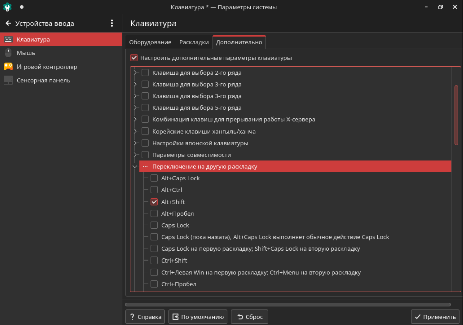 Для настройки раскладок клавиатуры необходимо открыть «Меню запуска приложений» — «Настройка» — «Параметры системы», выбрать подраздел «Устройства ввода» и перейти во вкладку «Клавиатура» — «Раскладки».