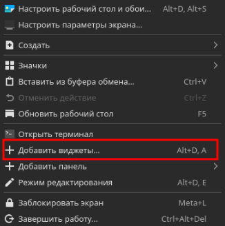 Для выбора в системной панели рабочего стола необходимых элементов пользователю необходимо на системной панели нажать ПКМ и в появившемся контекстном меню выбрать действие «Добавить виджеты...».