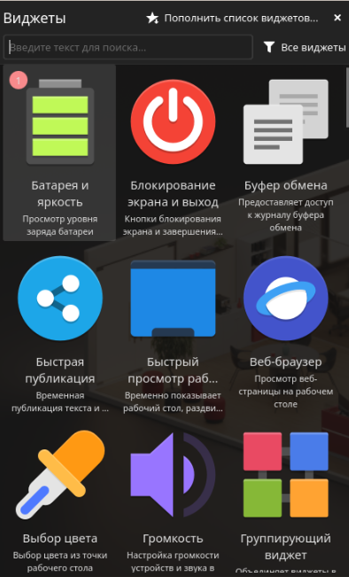 В открывшемся окне пользователь может выбрать из перечня доступных виджетов нужный и добавить его на панель нажатием ЛКМ. Если виджет уже добавлен на панель, в левом верхнем углу отображается счетчик копий добавленных виджетов.
