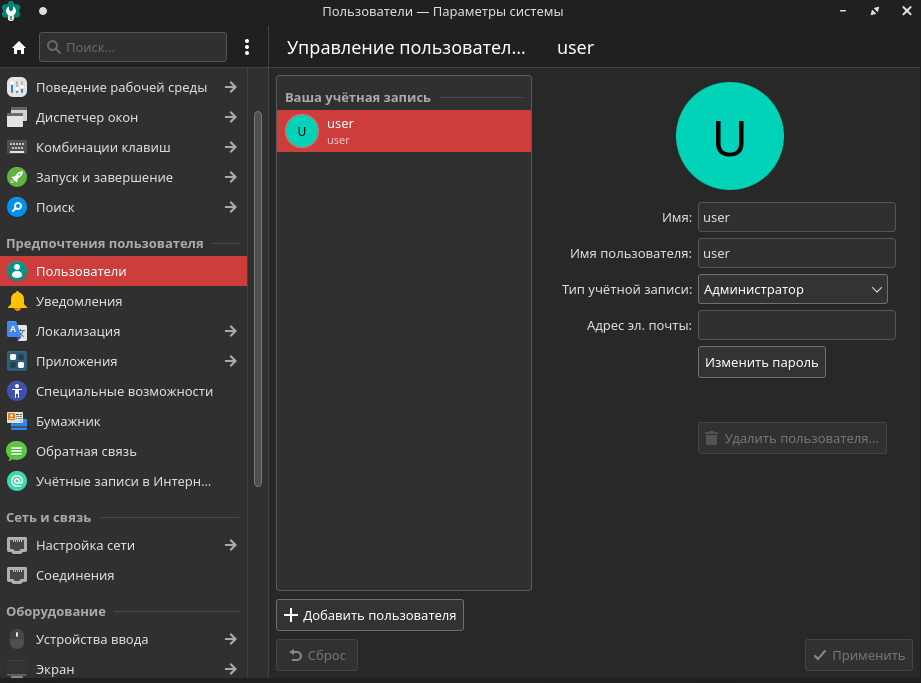 тип учетной записи — обычный пользователь или администратор (для повышения привилегий обычного пользователя до администратора потребуются права суперпользователя);