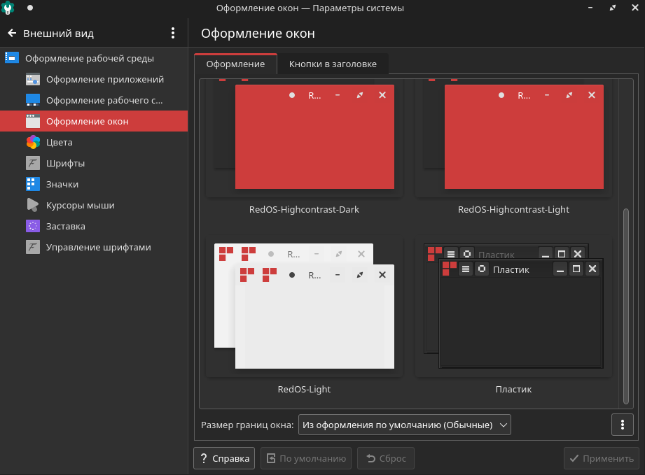 Для смены внешнего вида окон графической оболочки РЕД ОС пользователю необходимо открыть «Меню запуска приложений» — «Настройка» — «Параметры системы» и выбрать раздел «Внешний вид», в открывшемся окне необходимо перейти во вкладку «Оформление окон».