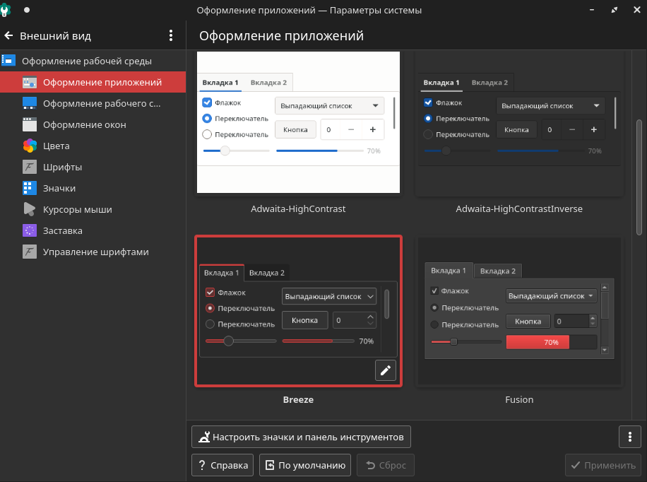 Также можно задать стилевое оформление отдельных элементов интерфейса, полностью независимое друг от друга и от темы рабочего стола. Для этого необходимо перейти во вкладку «Оформление приложений».