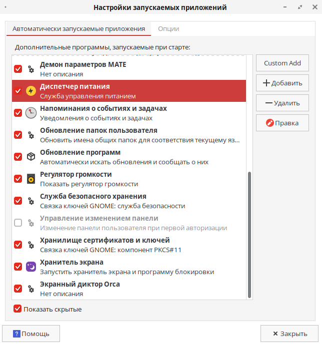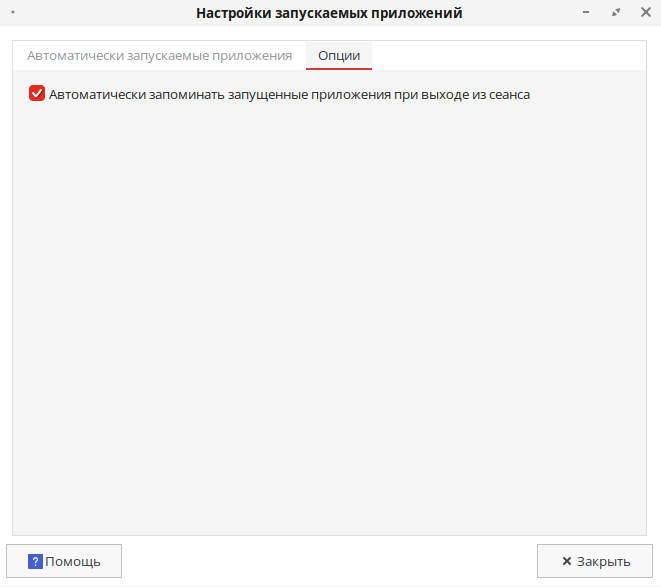 На вкладке «Опции» доступна настройка запоминания запущенных приложений при выходе из сеанса, т. е. при следующем старте системы открытые ранее программы будут автоматически запущены.