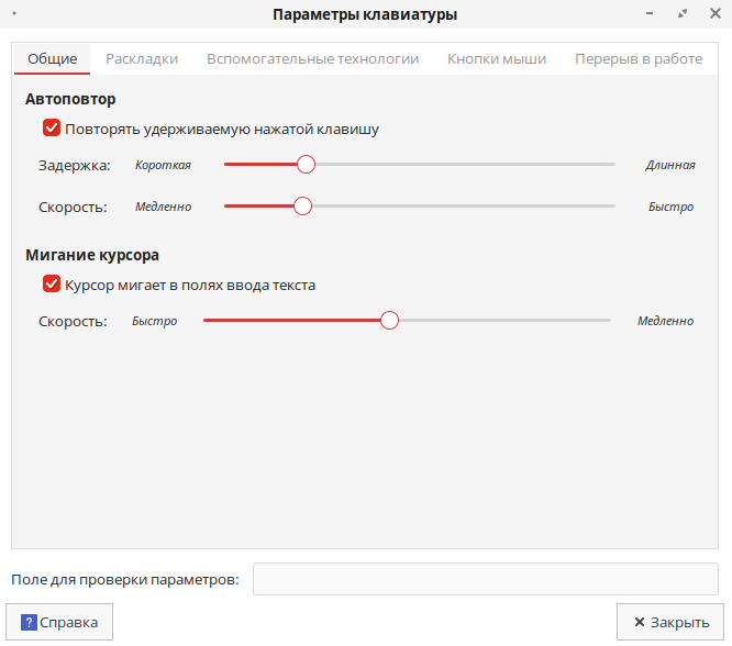 На вкладке «Общие» задается автоповтор нажатых клавиш и скорость мигания курсора в полях ввода.