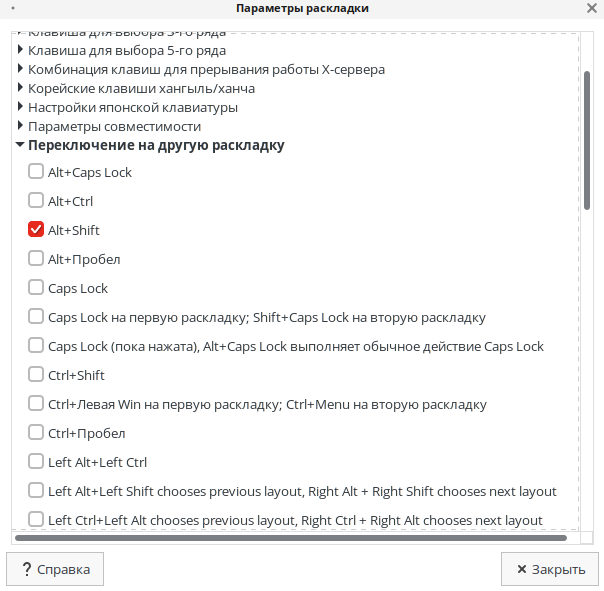 В РЕД ОС по умолчанию смена раскладки клавиатуры (языка ввода) осуществляется при одновременном нажатии функциональных клавиш клавиатуры Shift + Alt одновременно. Для изменения сочетания функциональных клавиш, применяемых для смены раскладки клавиатуры, необходимо в системной панели перейти в «Главное меню» - «Параметры» - «Клавиатура».