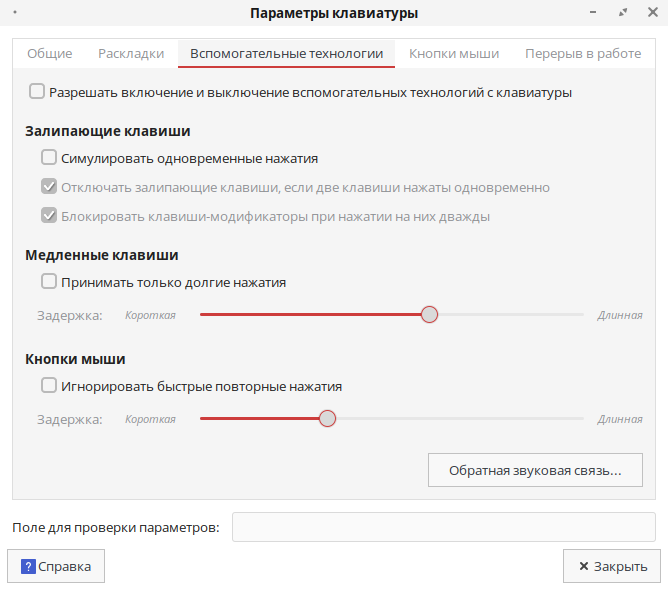 На вкладке «Вспомогательные возможности» определяется необходимость использования вспомогательных технологий с клавиатуры, задается поведение залипающих клавиш, медленные нажатия и реагирование на кнопки мыши. Также можно настроить обратную звуковую связь, например, при активном Caps Lock и нажатии какой-либо клавиши будет подаваться звуковой сигнал.