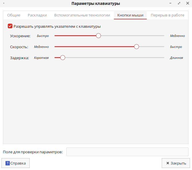 На вкладке «Кнопки мыши» задается разрешение на управление курсором мыши с клавиатуры.