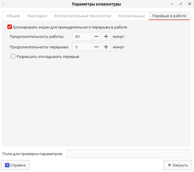 На вкладке «Перерыв в работе» можно задать продолжительность работы и перерыва. При достижении указанной продолжительности работы экран будет заблокирован.