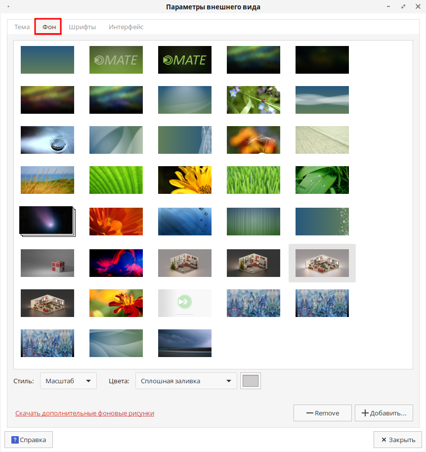 На вкладке «Фон» можно выбрать изображение из имеющихся или добавить собственное, нажав кнопку «Добавить...».
