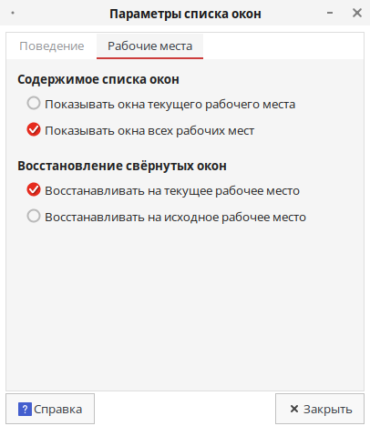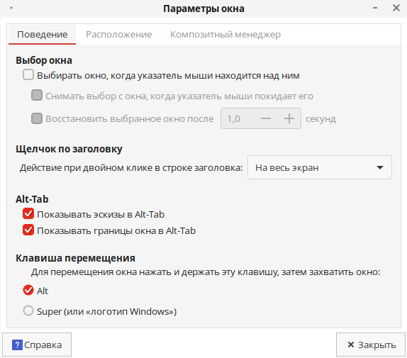 На вкладке «Поведение» можно настроить отклик окон на поведение мыши, а также настроить переключение между окнами при помощи комбинации клавиш Alt+Tab.