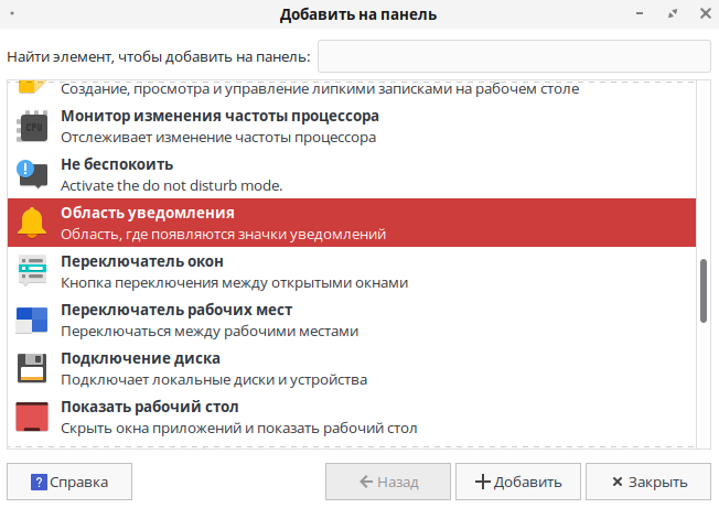 Апплет "Область уведомления" добавляет на панель системный лоток (трей) - ( ).