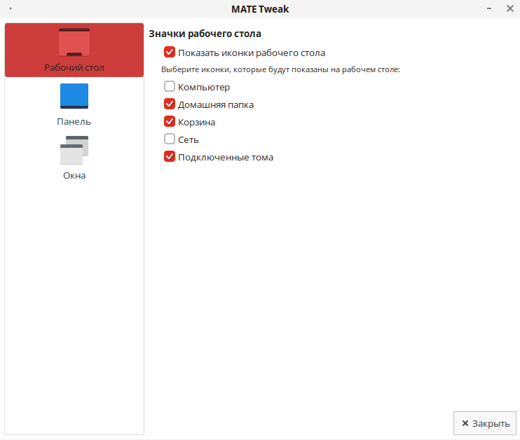 Вкладка «Рабочий стол» позволяет настроить рабочий стол MATE: включить или отключить отображение иконок, отвечающих за различные функции.