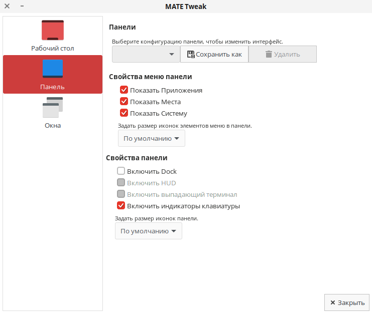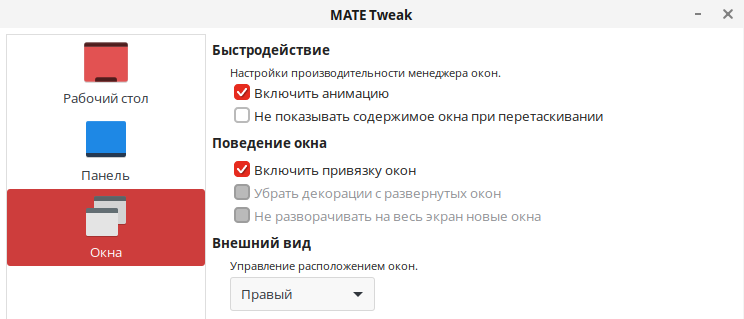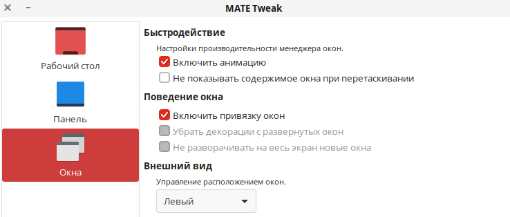 После установки утилита доступна из «Главного меню» — «Параметры» — «MATE Tweak».