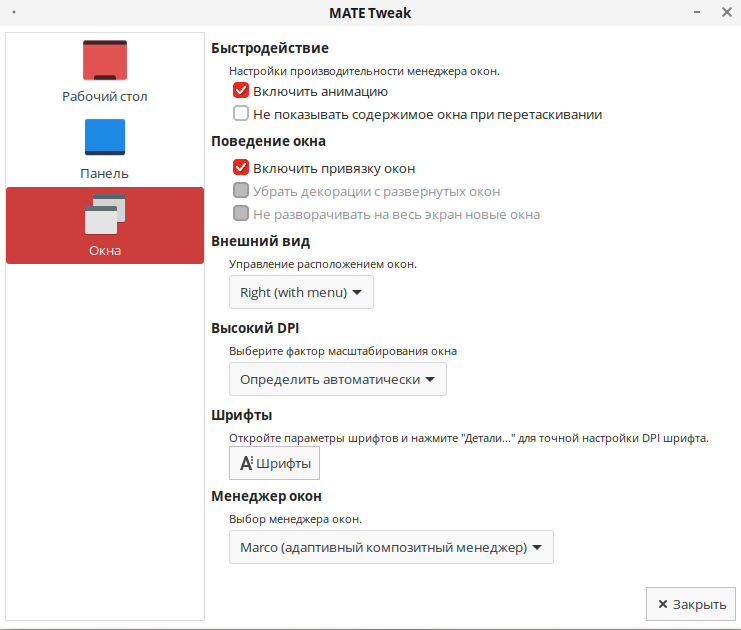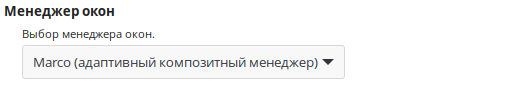 Настройка «Менеджер окон» позволяет выбрать менеджер окна, используемого в системе. По умолчанию установлен менеджер окна Marco.