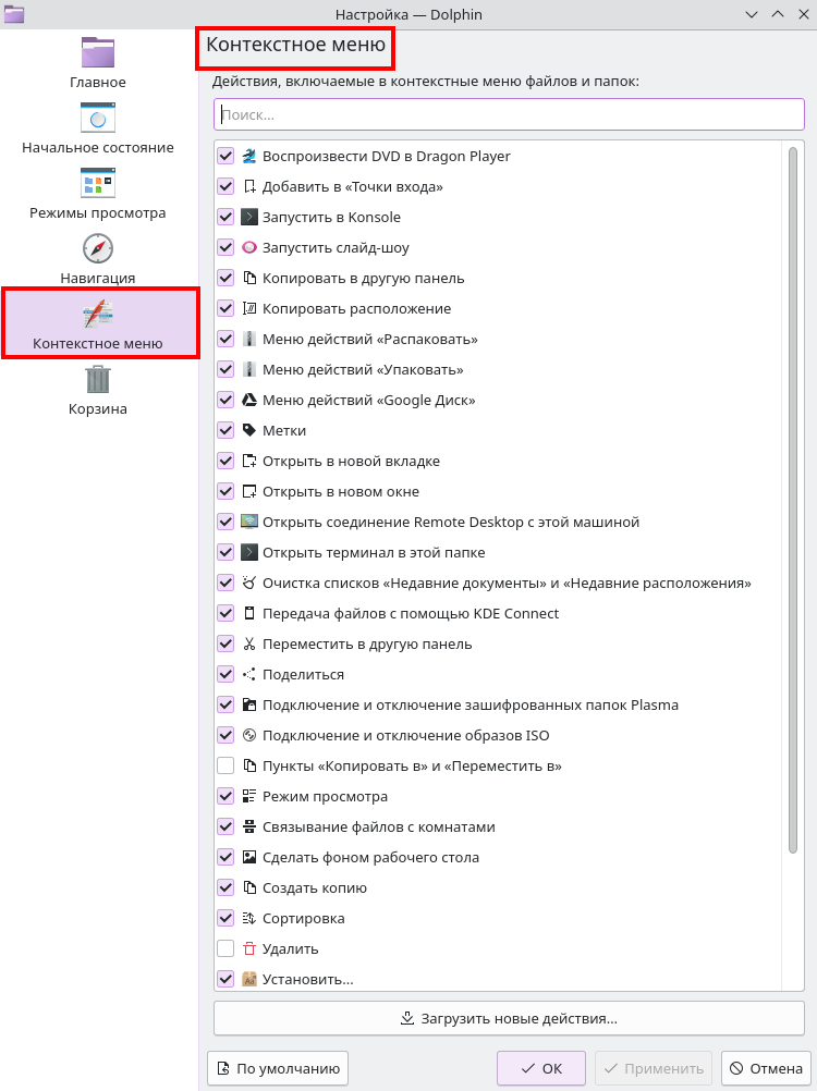 «Контекстное меню» — настройка действий, включаемых в контекстное меню файлов и директорий.