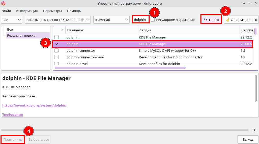 Для установки Dolphin через графический менеджер пакетов dnfdragora перейдите в «Главное меню» — «Администрирование» — «Управление программами dnfdragora», выполните поиск необходимого пакета по ключевому слову «dolphin» и отметьте флагом пакет последней версии. После этого нажмите кнопку «Применить» и дождитесь окончания установки.