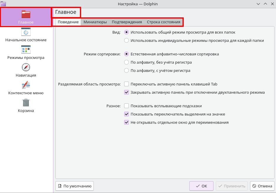 «Главное» — параметры, определяющие общее поведение менеджера Dolphin — индивидуальные/общие режимы просмотра директорий, режимы сортировки, отображение всплывающих подсказок, переключение активной панели, отображение миниатюр отдельных файлов в директориях, запрос подтверждений действий, отображение строки состояния.