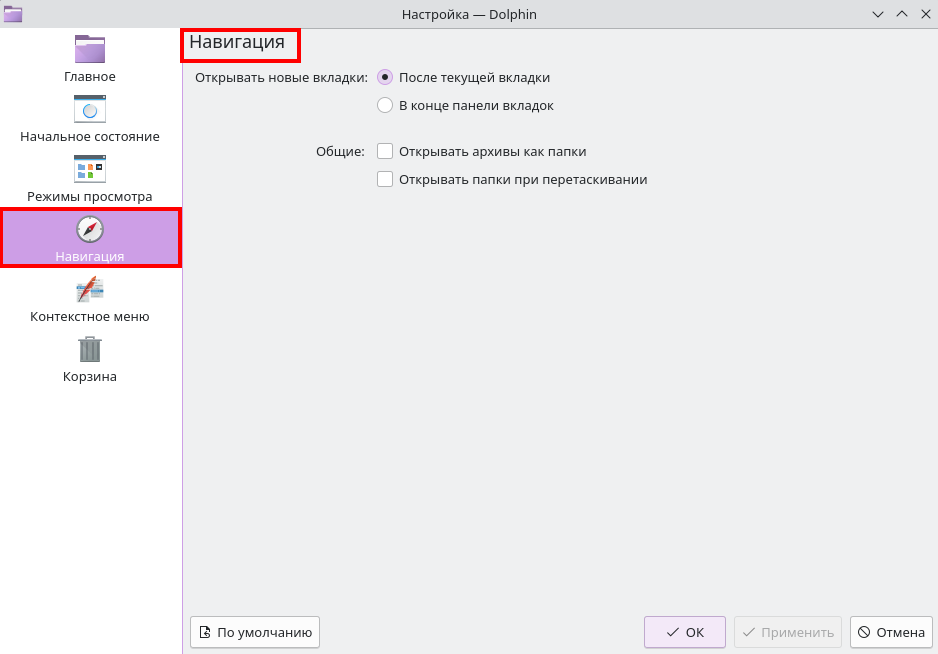 «Навигация» — параметры перехода между объектами в файловой системе — настройка запуска новых вкладок, перетаскивание объектов при помощи мыши, открывание архивов.