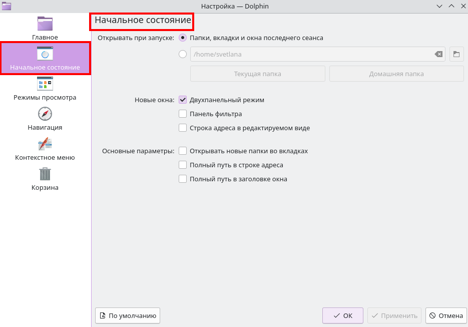 «Начальное состояние» — параметры, определяющие вид окна файлового менеджера при запуске — открытие определенной директории при запуске Dolphin, запуск однопанельного/двухпанельного режима просмотра, отображение панели фильтра, вид строки состояния.