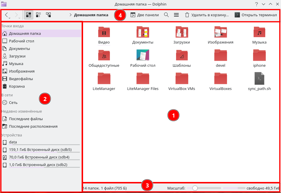 После запуска файлового менеджера откроется стартовая страница Dolphin, которая выглядит следующим образом: