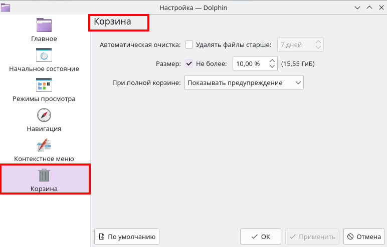 «Корзина» — настройка параметров поведения директории «Корзина» — определение размера корзины, настройка автоматического удаления старых файлов, настройка действий при заполнении корзины.