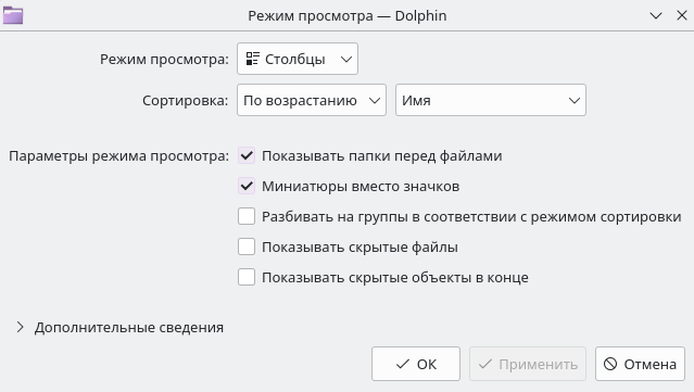 - Настройка режима просмотра объектов — параметры отображения содержимого директорий, позволяющие определять: