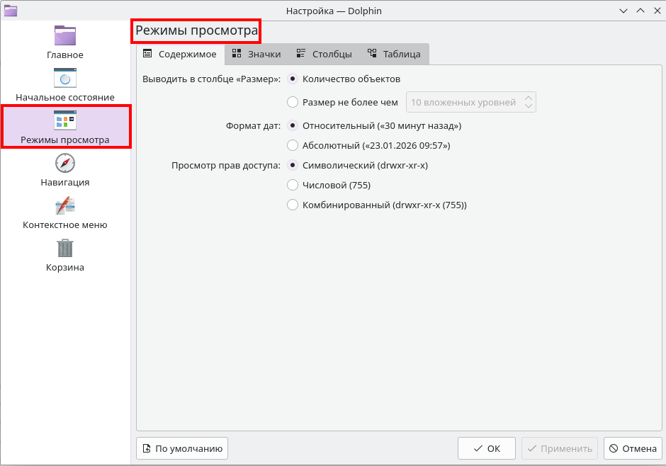 - Настройка общего поведения менеджера Dolphin — окно «Настрока Dolphin». Для настройки общего поведения Dolphin во вкладке «Настройка» выберите раздел «Настрока Dolphin». На экране появится диалоговое окно с несколькими разделами: