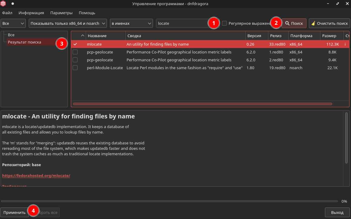 Для установки утилиты через графический менеджер пакетов dnfdragora перейдите в «Главное меню» - «Администрирование» - «Управление программами dnfdragora», выполните поиск необходимого пакета по ключевому слову «mlocate» и отметьте флагом пакет последней версии. После этого нажмите кнопку «Применить» и дождитесь окончания установки.
