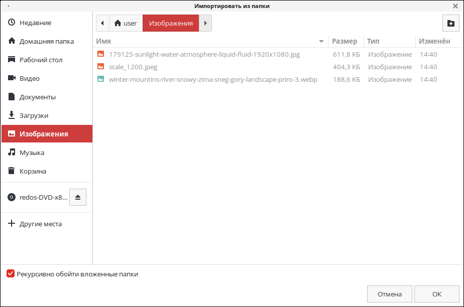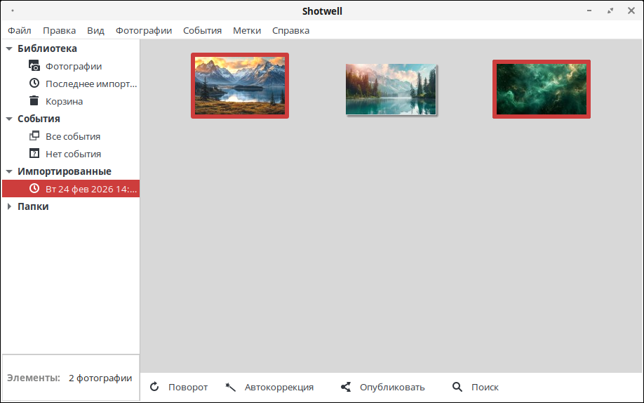 Для создания слайд-шоу из собственных снимков/обоев в домашнем каталоге предварительно должны быть подготовлены изображения, которые будут импортированы в Shotwell. Для импорта подготовленных изображений выберите пункт меню «Файл» — «Импортировать из папки...», откройте каталог с изображениями и нажмите «ОК».