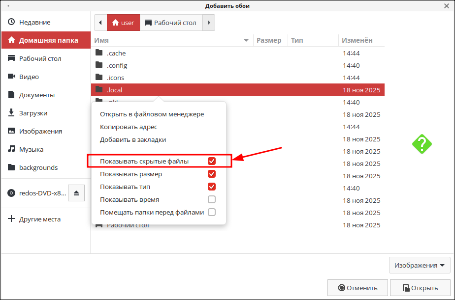 В каталоге «Домашняя папка» кликните ПКМ и активируйте флаг для параметра «Показывать скрытые файлы».