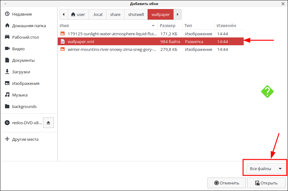 Созданное слайд-шоу с именем wallpaper.xml будет расположено в каталоге ~/.local/share/shotwell/wallpaper. В настройках отображения укажите «Все файлы» и выберите файл слайд-шоу. Нажмите «Открыть».