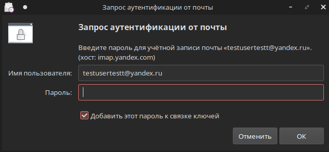 При первом запуске Evolution снова запросит пароль для подключения к почте. Введите пароль. После этого при последующих запусках Evolution пароль запрашиваться не будет.