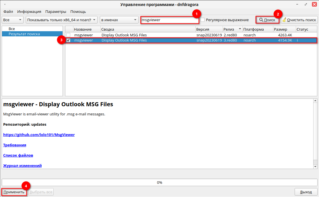 Для установки программы через графический менеджер пакетов dnfdragora перейдите в «Главное меню» — «Администрирование» — «Управление пакетами dnfdragora», выполните поиск необходимого пакета по ключевому слову «msgviewer» и отметьте флагом пакет последней версии. После этого нажмите кнопку «Применить» и дождитесь окончания установки.