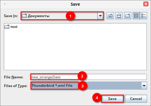2. Укажите расположение, имя файла, выберите расширение .eml и нажмите «Save».