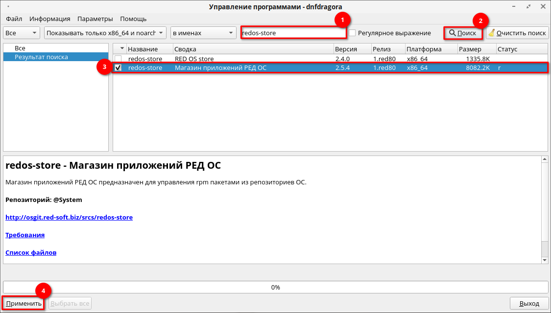 Для установки Магазина через графический менеджер пакетов dnfdragora перейдите в «Главное меню» — «Администрирование» — «Управление пакетами dnfdragora», выполните поиск необходимого пакета по ключевому слову «redos-store» и отметьте флагом пакет последней версии. После этого нажмите кнопку «Применить» и дождитесь окончания установки пакетов.
